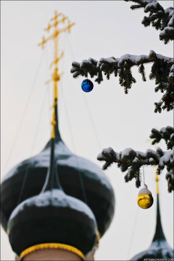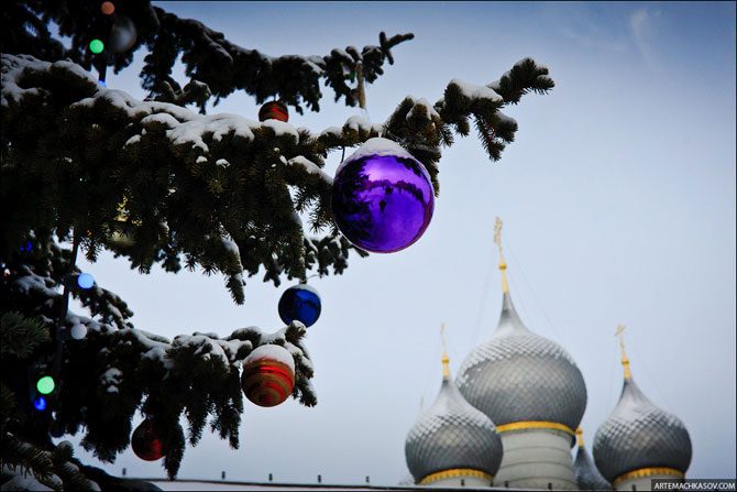 Наряженная ель на фоне храма. В крытых переходах крепостных стен гнались друг за другом герои классического советского кино-хита «Иван Васильевич меняет профессию».