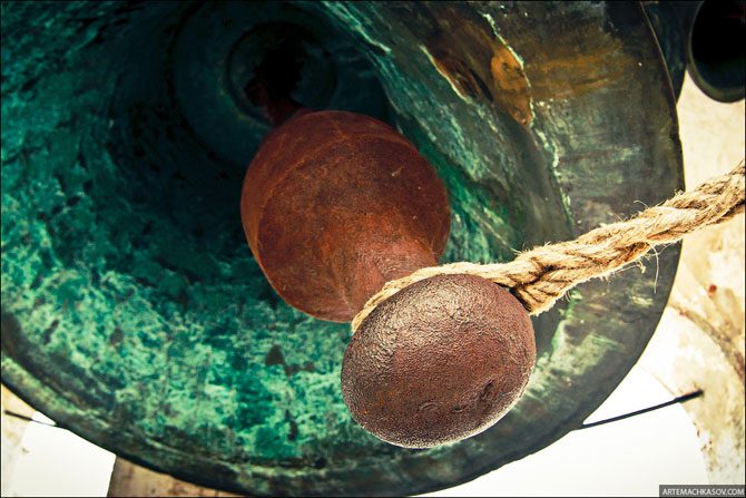 У всех колоколов звонницы – свои имена и история. Слева – колокол Лебедь, весом в пятьсот пудов, отлит одновременно с «Полиелейным» в 1682 году.