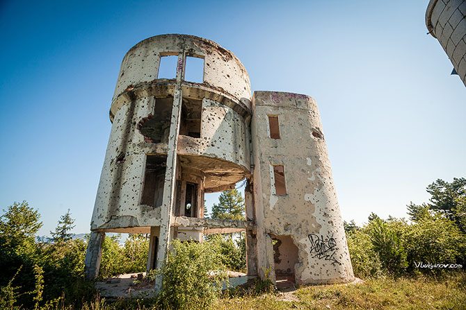 Когда мы вернулись на исходную позицию к арке с надписью «GRO BOSNA SARAJEVO», мы планировали вернуться в город, как вдруг заметили, новый поворот дороги по которой мы пришли. В направлении нового пути виднелись какие-то здания. На одно полуразрушенное я залез. Оттуда открывается хороший вид на окрестности. И на соседний домик.
