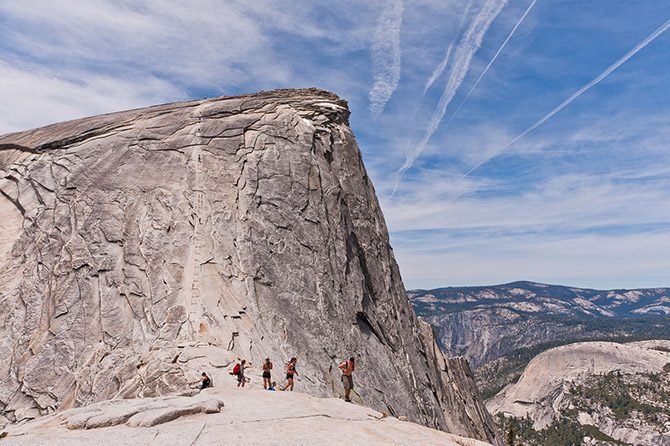США. Калифорния. Скала Хаф-Доум (2694 м над уровнем моря). Объект является одним из символов Национального парка Йосемити. Ежегодно на её вершину поднимаются около 50 000 человек. Последние 150 м из 12 км маршрута представляют собой специальную канатную тропу, созданную в 1919 году.