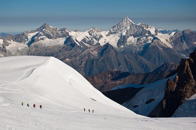 Швейцария. Вале. Горный массив Монте-Роза. Начинающим альпинистам предлагается три классических направления — Поллукс (4 092 м), Брайтхорн (4 164 м) и Кастор (4 228 м). Лучшее время для восхождения — с июня по октябрь. Все маршруты маркированы; имеются специально оборудованные места для ночлега. Базовая программа восхождения рассчитана на 7 дней.