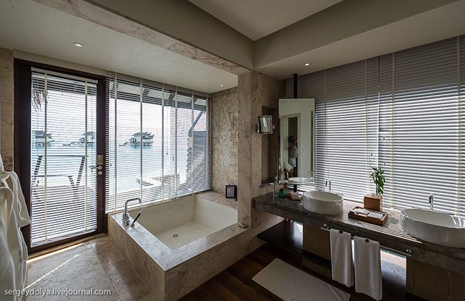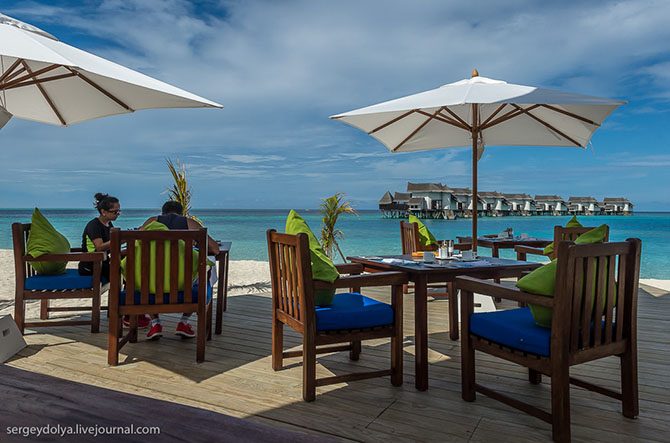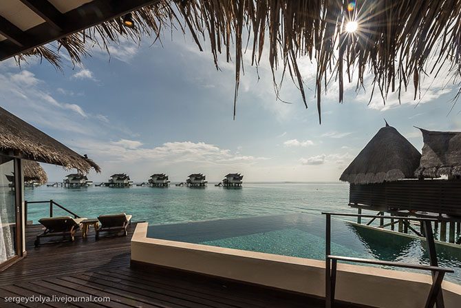 Построены они под углом друг к другу, так, что никто из соседей вас не увидит. В водных виллах тоже есть бассейн, а прямо за «балконом» – бесконечный океан: