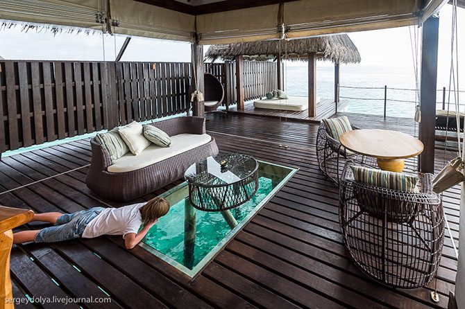 Под домиками плавают миллионы рыб, за которыми можно понаблюдать через специальное окошко в полу. Практически, естественный природный аквариум: