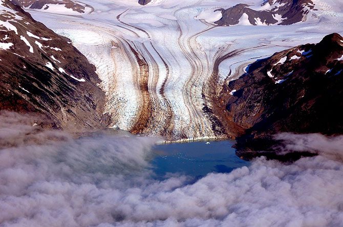 19-километровый ледник Джонса Хопкинса. Общим условием образования ледников является сочетание низких температур воздуха с большим количеством твёрдых атмосферных осадков.