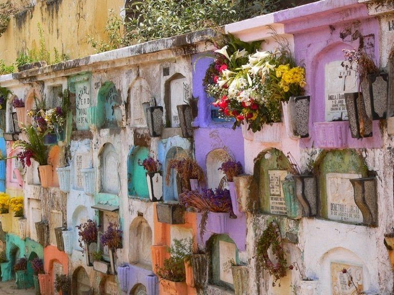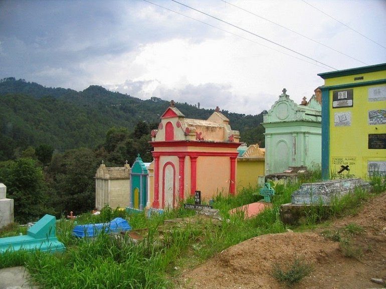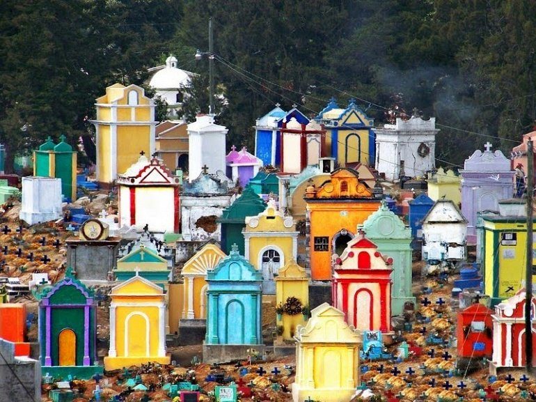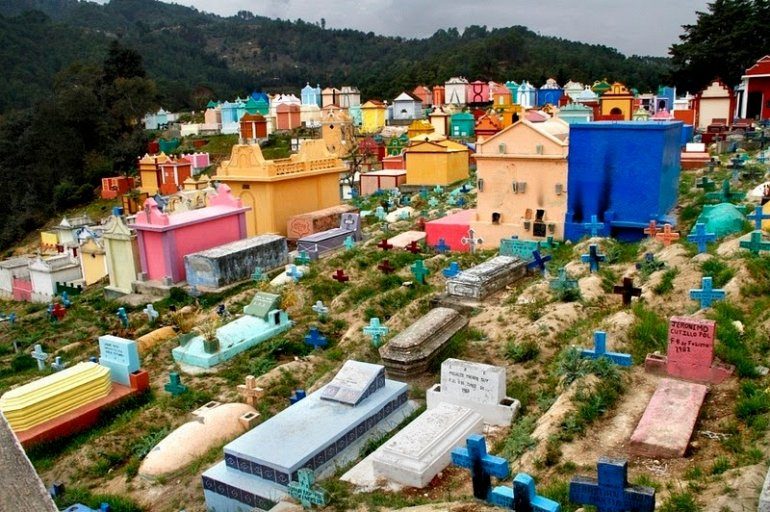 В культуре Гватемалы очень важное место занимает загробная жизнь, и этот культурный аспект мы очень четко видим на их кладбищах. Рассеянные по всей сельской местности Гватемалы кладбища очень легко распознать. Они отличаются ярко окрашенными надгробными плитами, пестрящими всевозможными цветами.