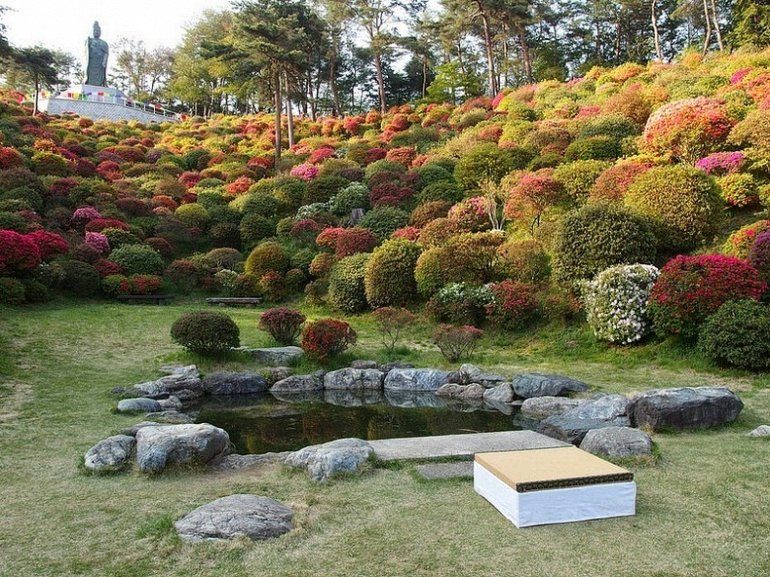 В период между апрелем и маем холмы загораются ярким цветом, когда 20,000 кустарников азалии раскрываются в полном цвету.