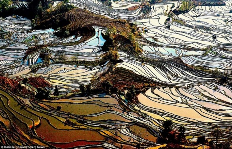 На первый взгляд кажется, что эти изображения похожи на фотографии причудливых витражей или картину художника-импрессиониста. В действительности же это одно из самых масштабных творений человека — рисовые поля на высотных террасах.