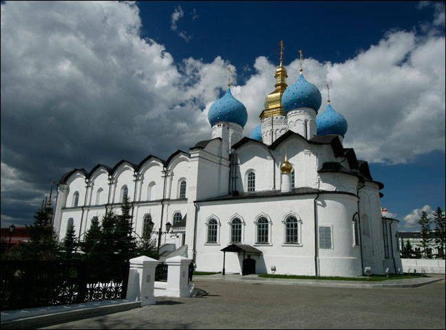 Благовещенский собор Казанского кремля (Казань) входит в число древнейших и интереснейших памятников русского церковного зодчества. Закладку деревянной церкви на месте будущего собора возводят к деяниям царя Ивана Грозного. Собор относят к псковской школе русского зодчества. В этот период мастерам Постнику Яковлеву и Ивану Ширяю было поручено отправиться в Казань для построения нового каменного города (кремля). Главы собора имели первоначально полукруглую форму, но в 1736 году были переделаны. Четыре главы стали луковичными, средняя глава собора была устроена в стиле украинского барокко, покрыта медью и вызолочена. Благовещенский собор в Казанском Кремле Он остается самым древним сооружением в ансамбле Кремля.