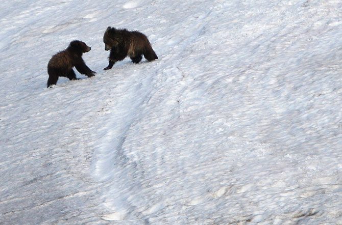 Играющие медвежата гризли на снегу в долине Хайден.