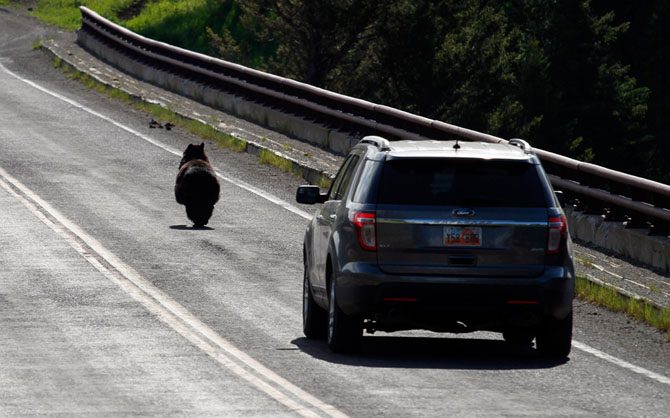 Медведь на мосту через реку Йеллоустоун недалеко от долины Ламар.
