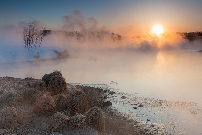 Ночью был мороз и звёзды, но это не пугает тех, кто приезжает сюда пожить не в домиках, а в палатках на берегу горячей реки.