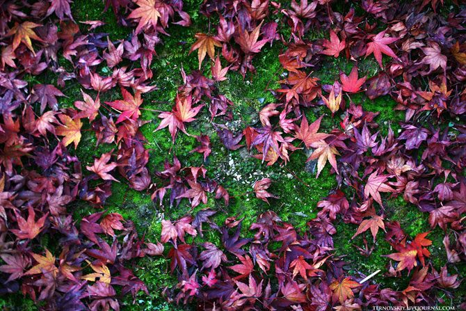 Склоны, поросшие мхом, покрыты опадающими кленовыми листьями.