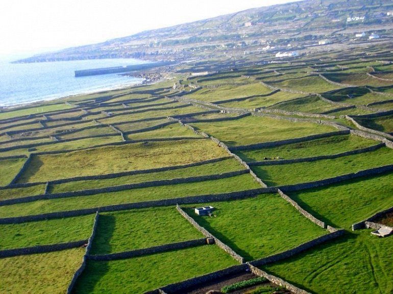 Одно из самых красивых мест с обширной сетью каменных стен — Аран. Это группа из трех островов, расположенных в устье Залива Голуэй на западном побережье Ирландии. Самый большой остров — Инишмор, некогда просто бесплодное скалистое место на краю Атлантики. Его жители на протяжение тысяч лет создали жизнь там, где ранее она была невозможна. Стены здесь также защищают тонкий слой почвы от выдувания ветром, очень часто бушующим в этих краях.