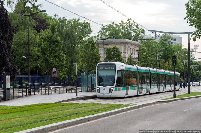 Трамвай идет по травке, очень красиво и экологично. Обратите внимание, как сделаны опоры для контактного провода, они красивые и элегантные. Минимум лишних проводов.
