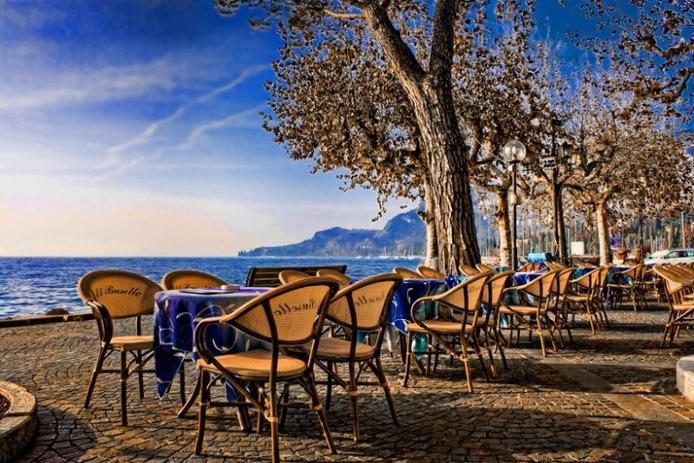 Озеро Гарда, пустые столики на берегу молчаливо и спокойно ждут посетителей