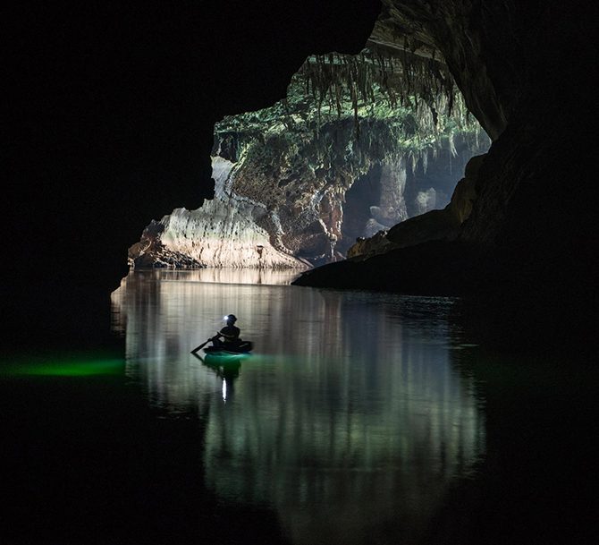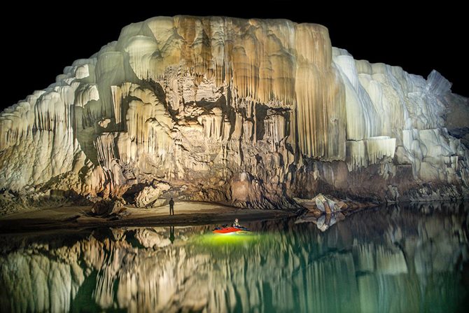 Люди на байдарках помогают оценить масштаб этой пещеры.