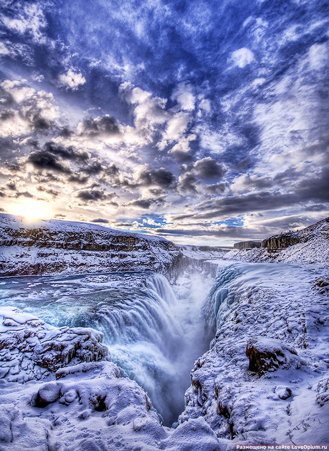 Водопад Гюдльфосс — «золотой водопад» (gull — золото; foss — водопад). Хотя глядя на эту HDR-фотографию он, скорее, замерзший.