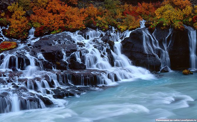 Водопад лавы Хрёйнфоссар — один из самых необычных, нигде в Европе такого не увидишь. Это целая серия небольших водопадиков, формирующиеся из многочисленных ручейков (более 100) протяжностью около 900 метров.
