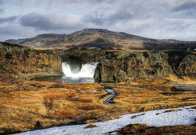 Это один из самых известных водопадов Исландии, находящийся на севере острова недалеко от Акюрейри. Водопад не самый высокий (12 метров), но один из самых посещаемых туристами водопадов Исландии. Его ширина составляет около 30 м.