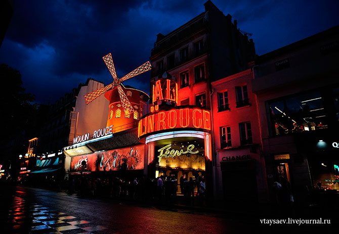 Особенно вечером вы можете увидеть изрезанный огнями ночных улиц город. И тогда, кажется, что вся мирская суета незначительна и начинаешь дышать спокойнее и ровнее. Наверху есть неплохое кафе, можете заказать бутылочку вина. И можно ждать, наблюдая за городом, когда зайдет солнце и включится городская иллюминация. Спустившись на площадь Пигаль, можно увидеть знаменитое кабаре Мулен Руж: