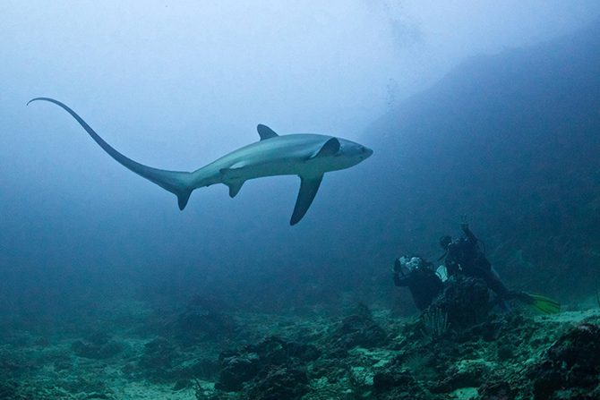 Пелагическая лисья акула или морская лисица. Лисьи акулы охотятся, используя свой длинный хвост, как хлыст. Они сбивают косяк рыб плотнее и оглушают им добычу. (Фото Noel Guevara | National Geographic Traveler Photo Contest):