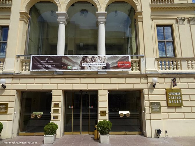 А вот и вход в знаменитое баденское казино – крупнейшее в Европе, оно рассчитано на 1000 человек одновременно. Посетителей любезно ждут 232 одноруких бандита, а ещё здесь можно попытать удачу в американской и простой рулетке, покере и блэк-джеке и прочих играх.