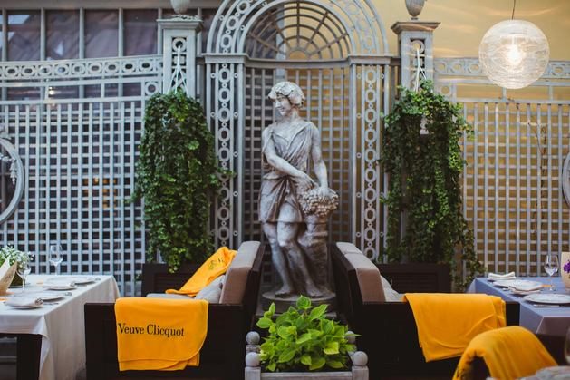Романтичная трельяжная терраса, утопающая в цветах и диком винограде, переносит гостей с крыши московского особняка в сады дворцово-парковых ансамблей Петербурга.