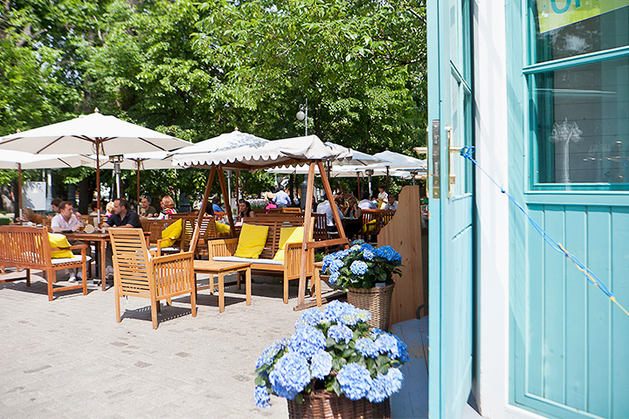 Одна из самых живописных открытых площадок столицы — в ресторане «Турандот», известном своим прихотливым декором: стилистика позднего барокко большая редкость в общественных интерьерах.