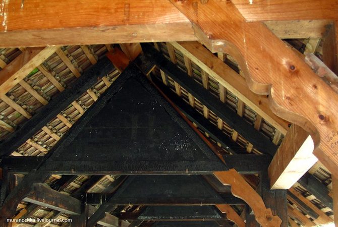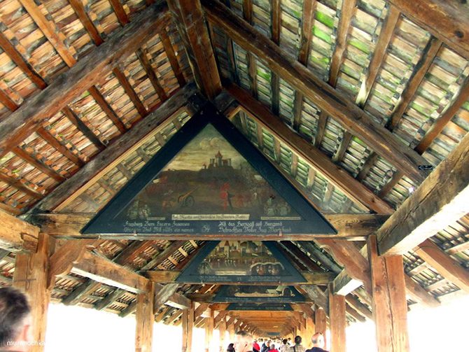Влетаем на мост Капелльбрюкке, и вот они, знаменитые треугольники потолочных балок моста, а в каждом из них – картины, которые создавались, начиная с 17-го века: