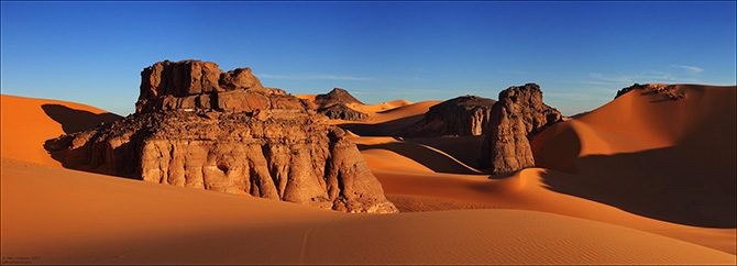Вы спросите, как мы ориентировались в пустыне? Я — никак. Туареги — примерно так же, как вы в своем квартале. Эти люди знают пустыню лучше, чем москвичи Москву. Они даже знают, где в пустыне добыть воду! Правда, ее лучше использовать только для мытья посуды. Каждая большая дюна у туарегов имеет свое название. Например, первую остановку мы делали у дюны Эль Бирч, что на третьей панораме.