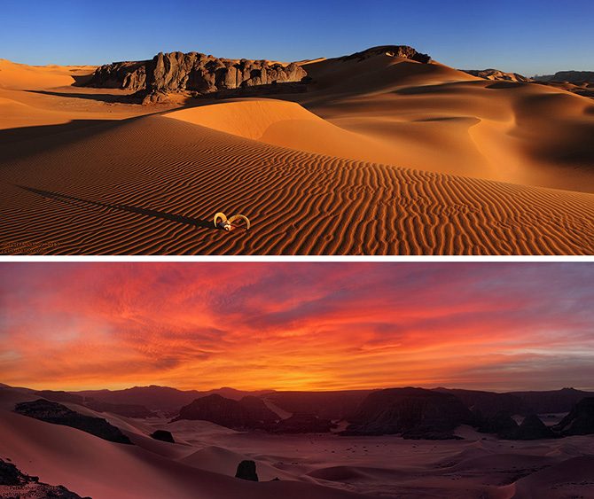 Мне говорили, что увидеть яркий закат или рассвет в Сахаре — это большая удача. Большая — это значит один раз за 10 дней. Видимо, природа компенсировала потраченные из-за потери багажа и общения с военными нервные клетки, ибо я 6 раз увидел красочное небо. Но один раз на небе был просто пожар!