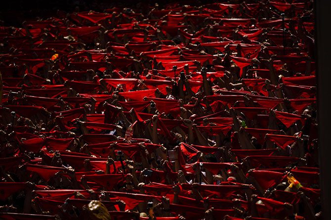 Такие традиционные красные шарфы, поднятые вверх, означают официальное открытие фестиваля Сан Фермин в Памплоне. Испания, 6 июля 2015.