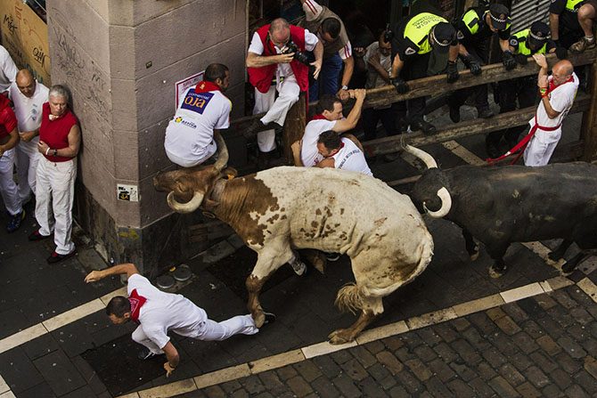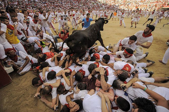 Во время знаменитого утреннего бега быков почти каждый год происходят тяжёлые несчастья, иногда человеческие жертвы. Обычно это происходит так: толпа, состоящая из искателей приключений, бежит впереди по улицам Памплоны, а быки их догоняют.