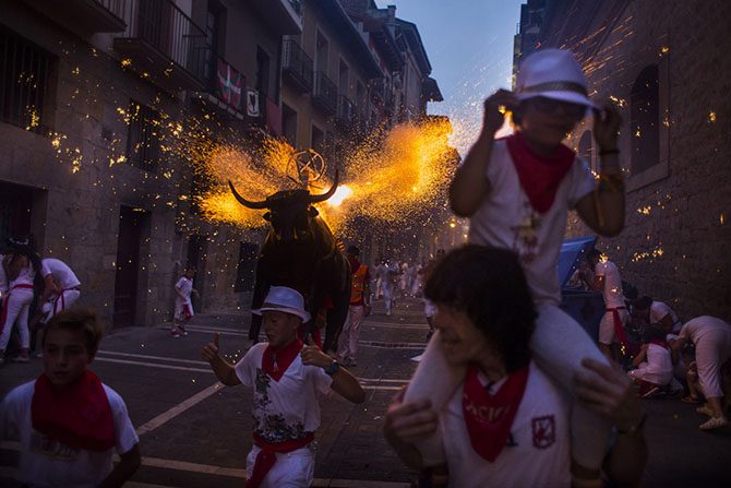 «Огненный» бык. Памплона, Испания, 6 июля 2015.