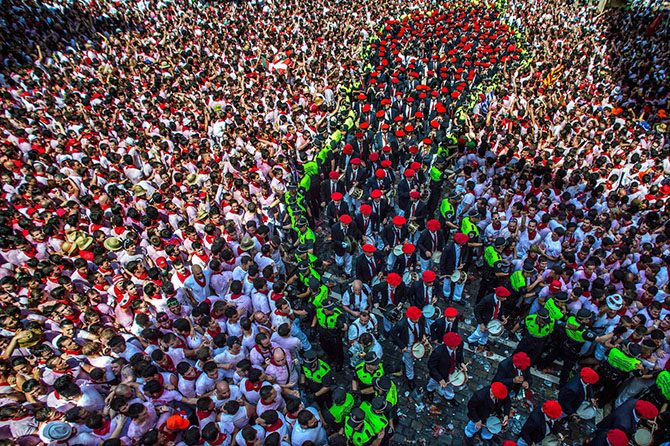 Толпы тут дикие, как и сам фестиваль. По зеленым линиям можно различить полицейских, которые ограждают от пришедших музыкантов. Памплона, Испания, 6 июля 2015.