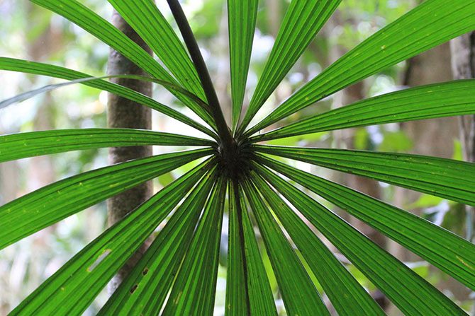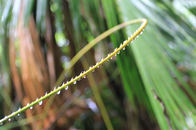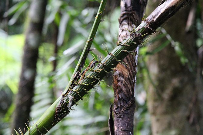Лозовая пальма — агрессивное растение. Она покрыта колючками и отращивает стрелы с когтями, которыми цепляется за деревья и кусты, чтобы они поднимали ее к солнцу.