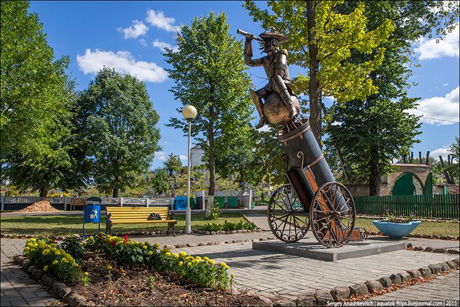 Рядом с кладбищем барону даже установили скульптурную композицию, в которой он готовится отправиться в одной из своих самых знаменитых путешествий на ядре.