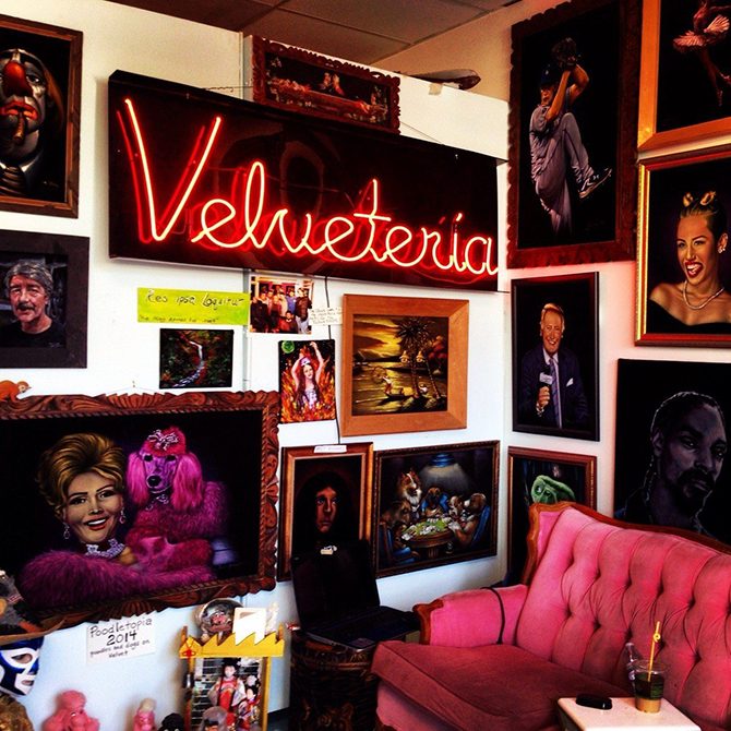 Давайте перейдём к менее отвратительной теме, а именно к музею Вельветерия, посвященному коллекционированию и демонстрации бархатных вещей. Он впервые открылся в Портленде в 2005 году, но позже переехал в Лос-Анджелес. В настоящее время он известен как «Вельветерия – Эпицентр Искусства, Сражающегося с Культурной Ограниченностью” (Velveteria Epicenter of Art Fighting Cultural Deprivation).
