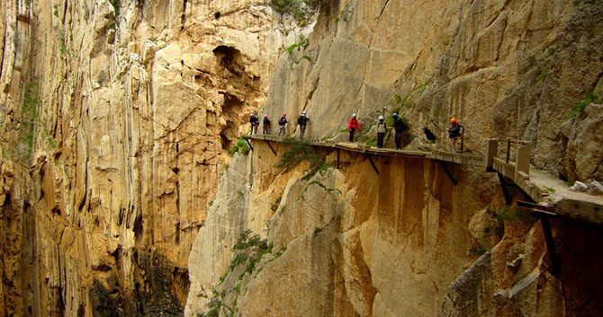 Да, по своему размеру или по комфорту путешествия эта тропа явно не «королевская». Она расположена в ущелье Эль Чорро в Малаге, Испания, и недавно была снова открыта после масштабной реконструкции. В 2000 году её закрывали после того, как здесь погибли 5 человек. Изначально тропа была проложена в 1905 году как вспомогательный путь для рабочих плотины Конде дель Гвадалорсе. Она названа в честь короля Испании Альфонсо XIII. Бетон и рельсы изначальной конструкции обветшали и частично развалились; сейчас она снова открыта.