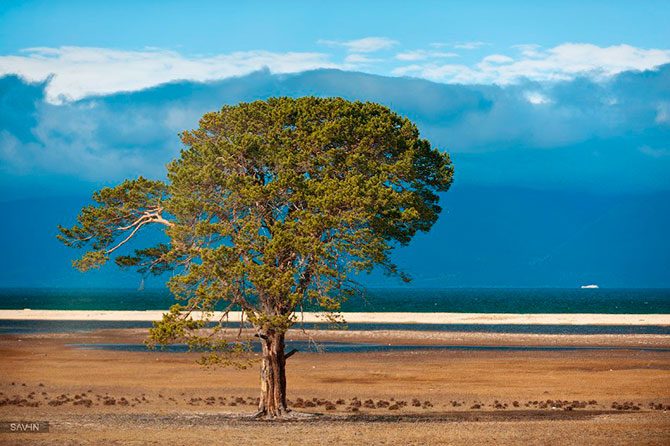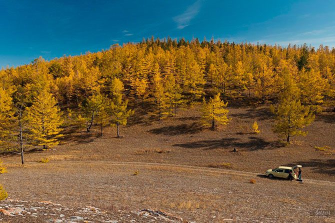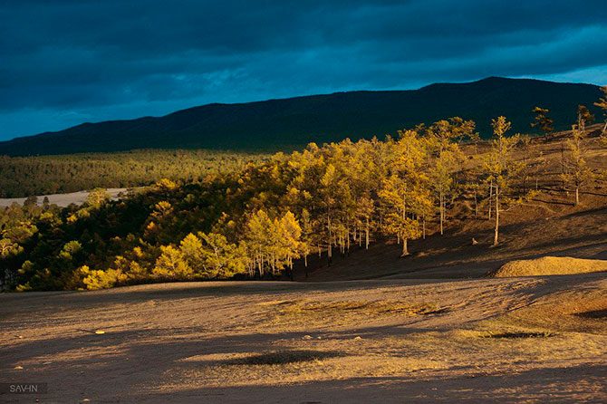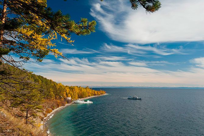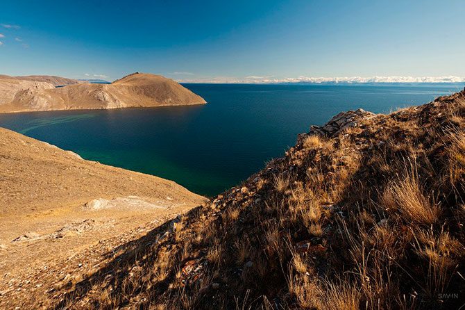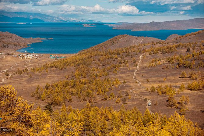 Дорога от Иркутска до Байкала лежит через гряды сопок, украшенных золотыми лиственницами. Вначале хорошее шоссе, затем зубодробительная грунтовка. Сопки сменяются полустепными участками. И вот с одной из вершин открывается вид на часть Байкала, называемую Маломорьем. Это живописное побережье, изрезанное небольшими бухтами и заливами. Мы находим ночлег на одной из пустующих в несезон турбаз, чтобы утром отправиться дальше.