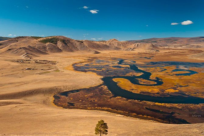 Дельта реки Анга. Контраст жёлтой травы и плавных, как по лекалу вычерченных темно-синих изгибов русла, великолепен: