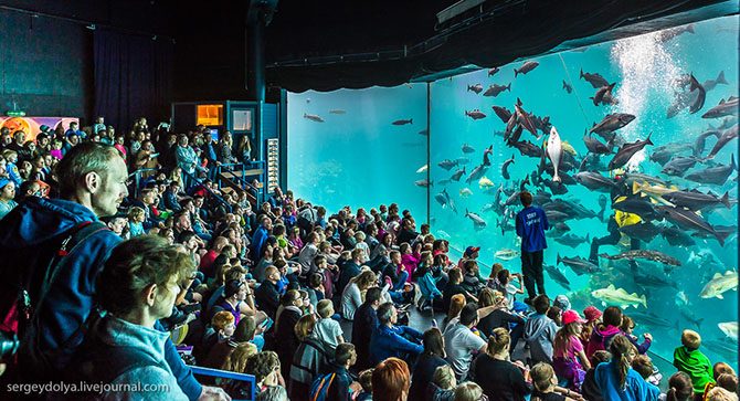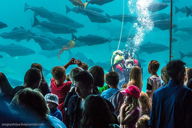 Главное шоу океанариума – кормление трески. «Трапеза» происходит в определенное время и собирает множество зрителей. Вода выглядит мутноватой, но это, видимо, потому что она берется из океана: