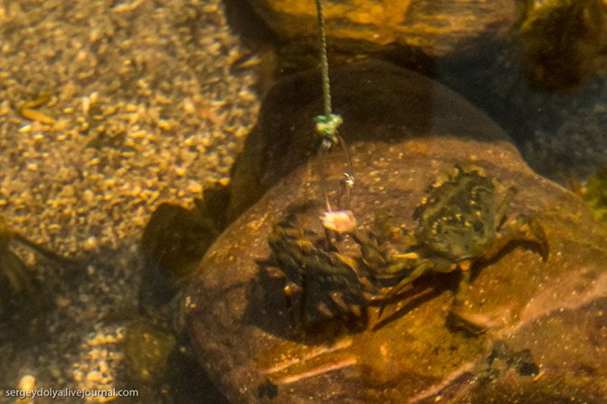 Очень крутой аттракцион «Поймай краба». Надо на скрепку насадить креветку или кусок рыбы и достать крабика. Развлечние вызывает негодование у «зеленых» и полный восторг у детей: