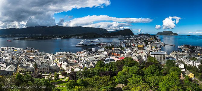 Чем же так покорил Алесунд? Он находится на перешейке между большой землей, где на небольшом клочке суши уютно расположились симпатичные домики. Некоторые из них прямо-таки нависают над водой, что вызывает ассоциации с Венецией. Если забраться на смотровую площадку, вид города открывается во всём своём великолепии. А если ещё поднять над ней коптер…