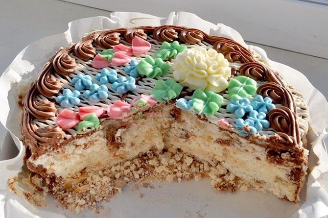 Представляет собой песочные коржи, прослоенные сливочным шоколадным кремом. Один из самых популярных тортов в советской кулинарии.