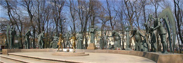 В парке за метро Фрунзенская, сразу после входа, стоит интересная скульптура-памятник, в виде зелёного дерева. Если на неё посмотреть внимательнее, то среди ветвей можно обнаружить человеческие лица, и прочую «жить» и «нежить».