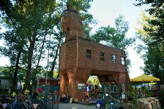 «У тройского коня» (не путать с троянским) — это бар, галерея, открытая площадка для творчества, театр, кинотеатр и место встреч приятных людей. Все это под открытым небом. Расположен на берегу Влтавы в районе Троя, недалеко от пражского зоопарка (куда, к слову, местные жители покупают абонементы на год, чтобы несколько раз в месяц проведывать белых медведей, слонов и других обитателей). Запомните название «Тройский конь» — и вы точно не ошибетесь, когда будете его искать: деревянного коня высотой десять метров пропустит только слепой. На месте можно заказать домашний лимонад, пиво, вино или что-то покрепче, чтобы расслабиться после прогулки. Если засидитесь, попросите хозяина заведения вызвать вам такси, так как добираться до центра не так уж близко. Не поленитесь посмотреть на то, как рядом на реке тренируются спортсмены: там оборудован коридор преград, искусственно создающий горное течение для байдарочников.