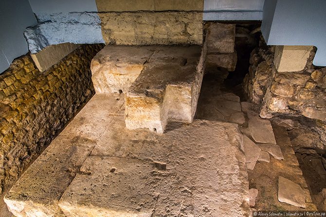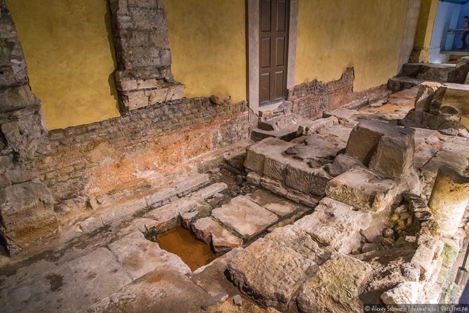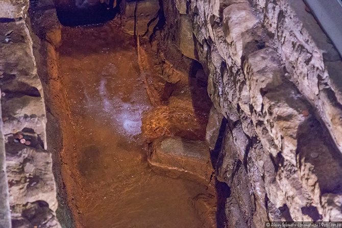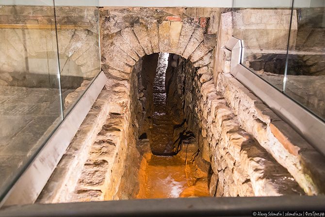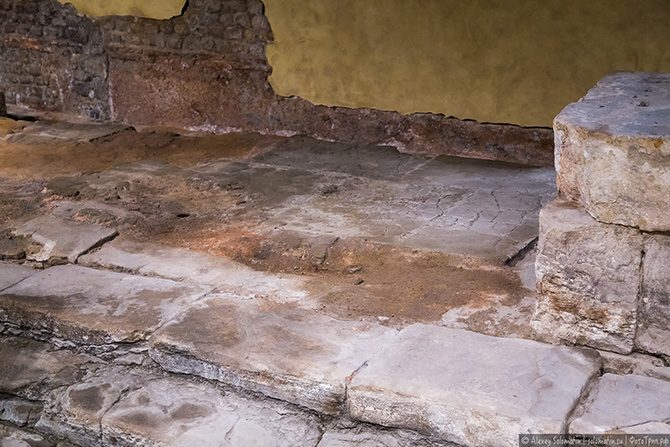 В нижнем пролете комплекса сделан мостик, с которого хорошо видно римскую укладку плит. Здесь очень влажно: