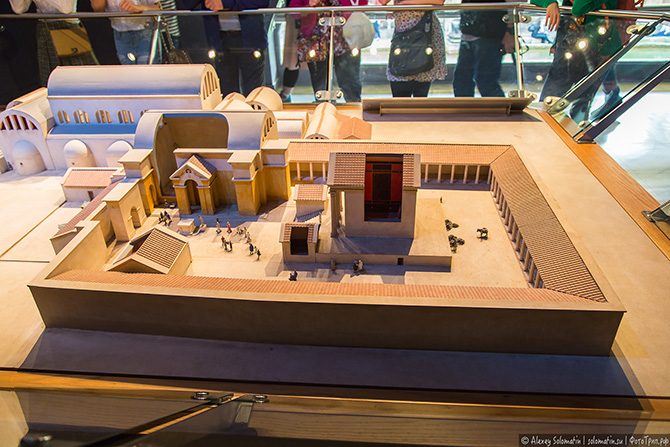 Вот макет римского комплекса. Справа видно, как подведена каналом термальная вода:
