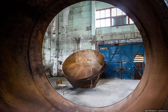 Здесь сохранились огромные чугунные котлы на железнодорожных тележках.